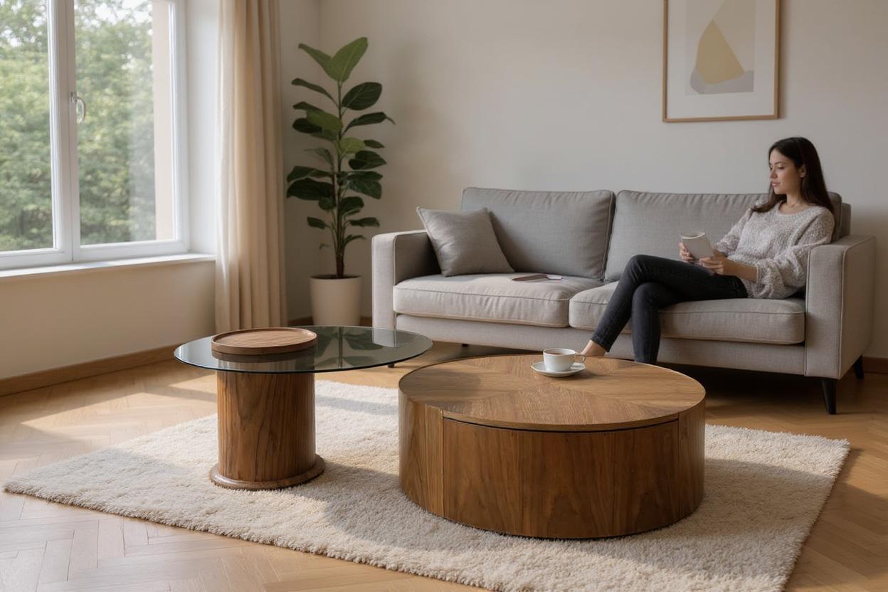Modern coffee tables featuring round wood and metal designs in a cozy living room setting with natural light