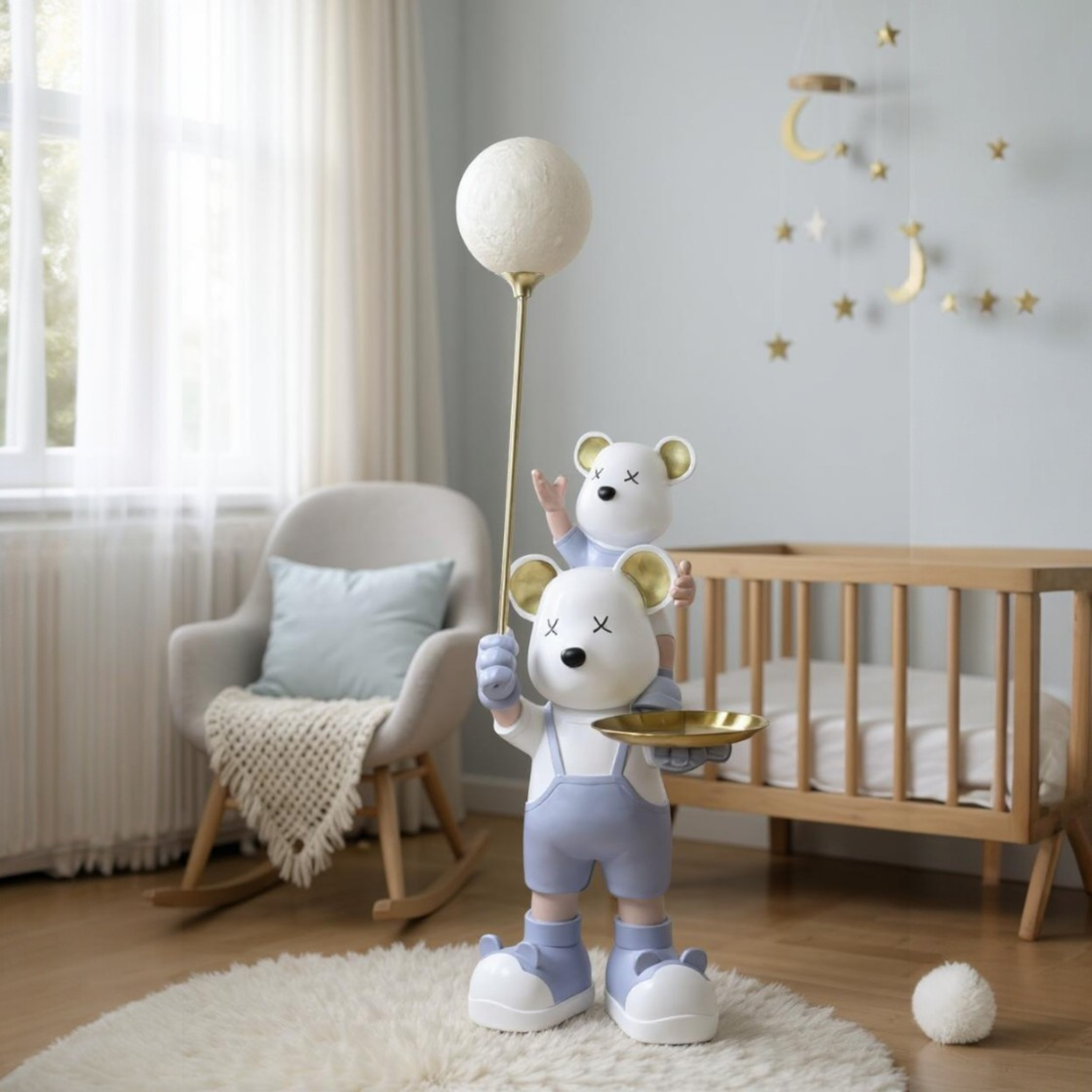Unique designer side tables featuring colorful glass bubble bases next to a dark sofa and floor lamp