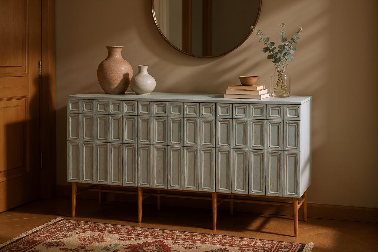 Modern living room featuring a stylish storage sideboard with geometric wood design and a woman reading nearby